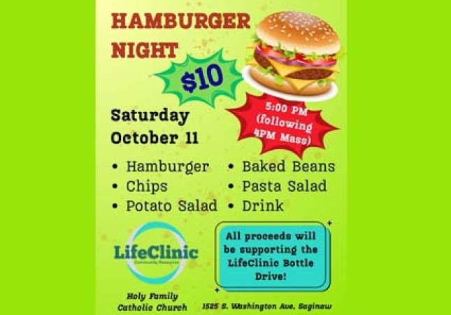 The Holy Family Ushers Club are hosting a "Hamburger Night" at Holy Family on Saturday October 11 at 5pm (immediately following the 4:00 mass). The requested donation is $10 with 100% of the proceeds being donated to the LifeClinic Bottle Drive.