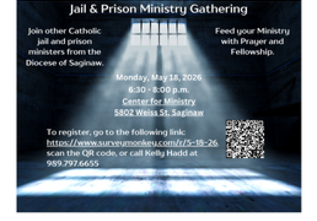 Join other Catholic jail and prison ministers from the Diocese of Saginaw to feed your ministry with prayer and fellowship. To register, click the link above or call Kelly Hadd at 989.797.6655. Have you ever considered Jail or Prison Ministry? Contact Kelly Hadd to learn more at khadd@diosag.org or call 989.797.6655.