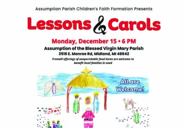 Come join us for a special evening of Scripture and song that all ages will enjoy, presented by Assumption Parish Children's Faith Formation. Reception with refreshments to follow, hosted by Knights of Columbus Council #2141.