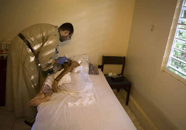 Brother Carlos J. Ramos Morales, a member of the Fraternal Society of Mercy, helps a terminally ill participant in 2015 at Belen Community near Mayaguez, Puerto Rico. (CNS photo/Tyler Orsburn)