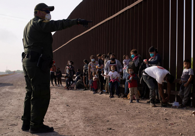 A Border Patrol agent in Penitas, Texas, instructs asylum-seeking migrants March 17, 2021, as they line up along the border wall after crossing the Rio Grande. Immigration and Customs Enforcement reports more than 12,000 coronavirus cases in detention centers. (CNS photo/Adrees Latif, Reuters)
